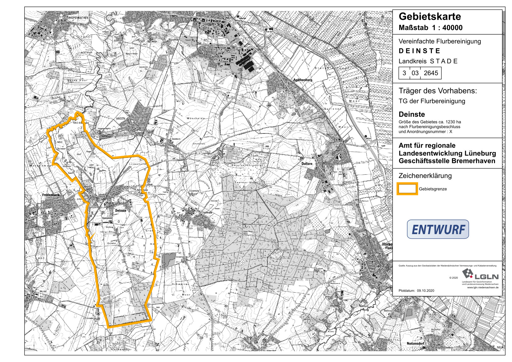 Das Verfahrensgebiet umfasst Teile der Gemarkungen Deinste und Groß Fredenbeck (SG Fredenbeck) sowie der Gemarkung Hagen (Stadt Stade), und liegt im Naturraum Stader Geest. Der Bereich ist stark landwirtschaftlich geprägt. Wie im gesamten ländlichen Raum ist die Landwirtschaft in den letzten Jahrzehnten durch einen fortschreitenden Strukturwandel gekennzeichnet.